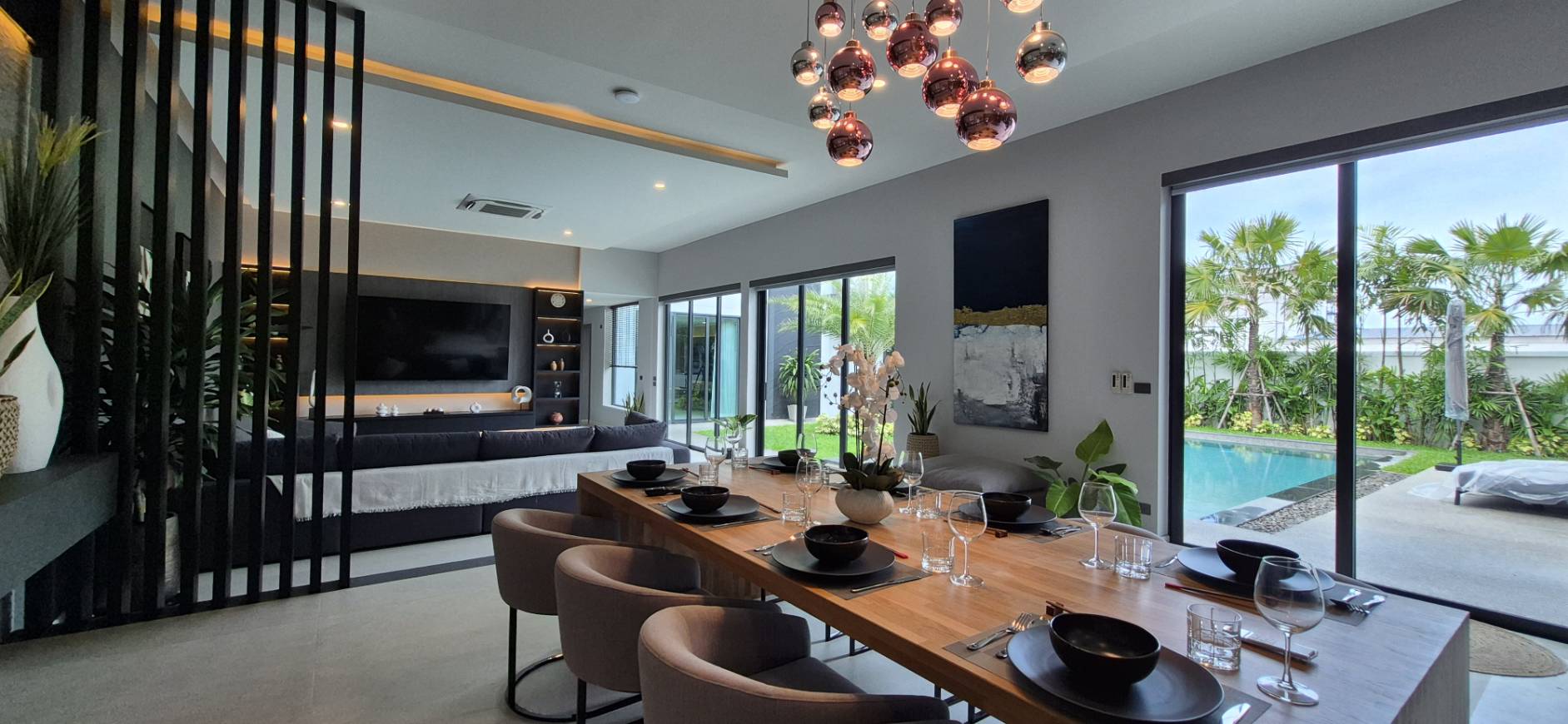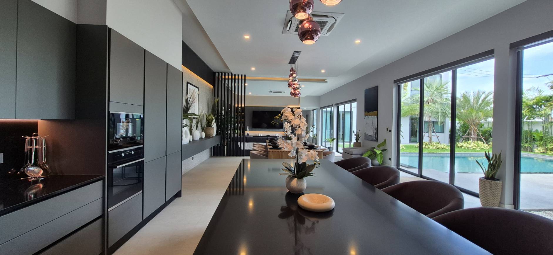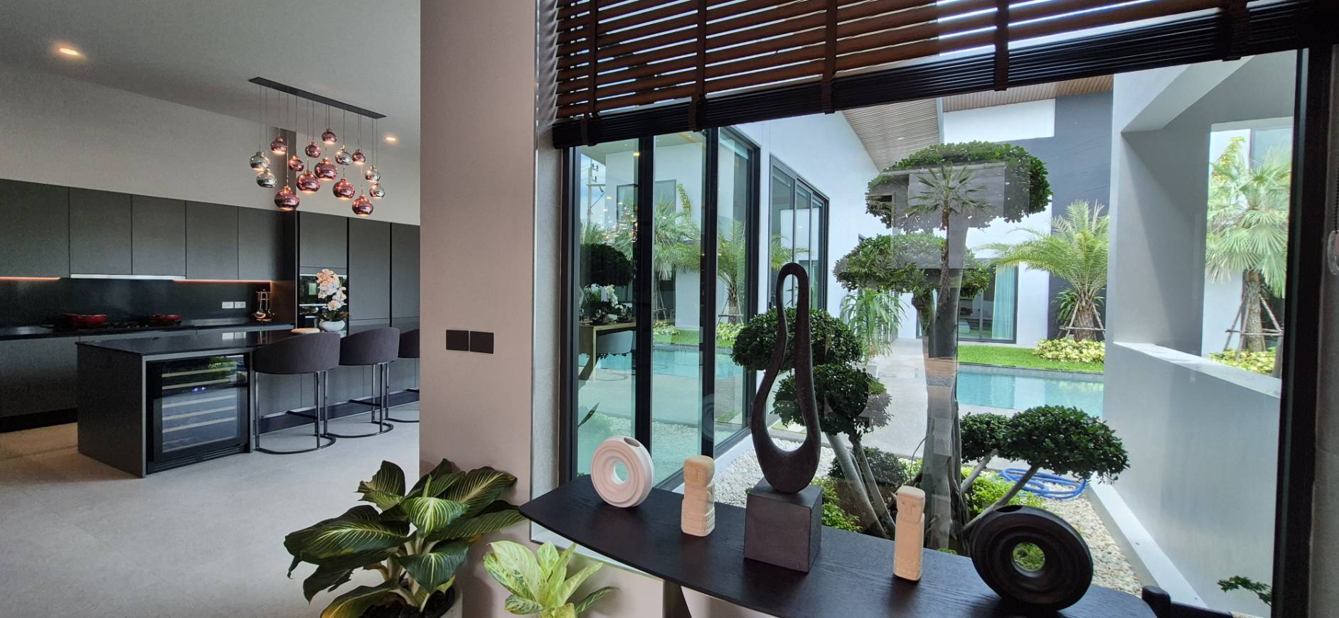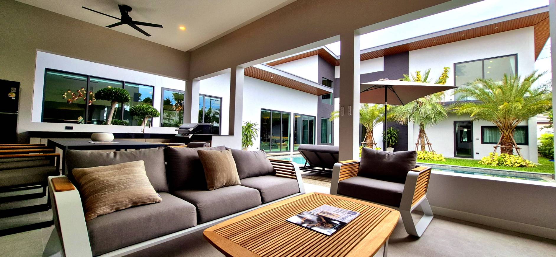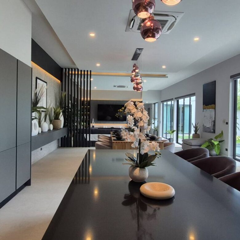 การออกแบบภายในของบ้าน Type B เน้นความโอ่อ่ากว้างขวางและประโยชน์ใช้สอยครบครัน เพดานสูงพิเศษ 3–4 เมตรช่วยเพิ่มความโปร่งโล่งให้ทุกพื้นที่ของบ้าน มาพร้อมห้องครัวสไตล์ยุโรปชุดใหญ่ที่ตกแต่งครบครันและเครื่องใช้ไฟฟ้าคุณภาพสูง พื้นที่นั่งเล่นและห้องรับประทานอาหารออกแบบเป็นโอเพ่นสเปซเชื่อมต่อกับวิวสระว่ายน้ำและสวนส่วนตัว สร้างบรรยากาศรีสอร์ทส่วนตัวที่ผ่อนคลาย ภายนอกตัวบ้านยังมีชานระเบียงกว้างสำหรับการสังสรรค์หรือพักผ่อนกลางแจ้ง ท่ามกลางสวนสวยเขตร้อนที่ตกแต่งอย่างพิถีพิถัน ทุกองค์ประกอบสะท้อนถึงรสนิยมและวิถีชีวิตระดับไฮเอนด์ของเจ้าของบ้านอย่างแท้จริง